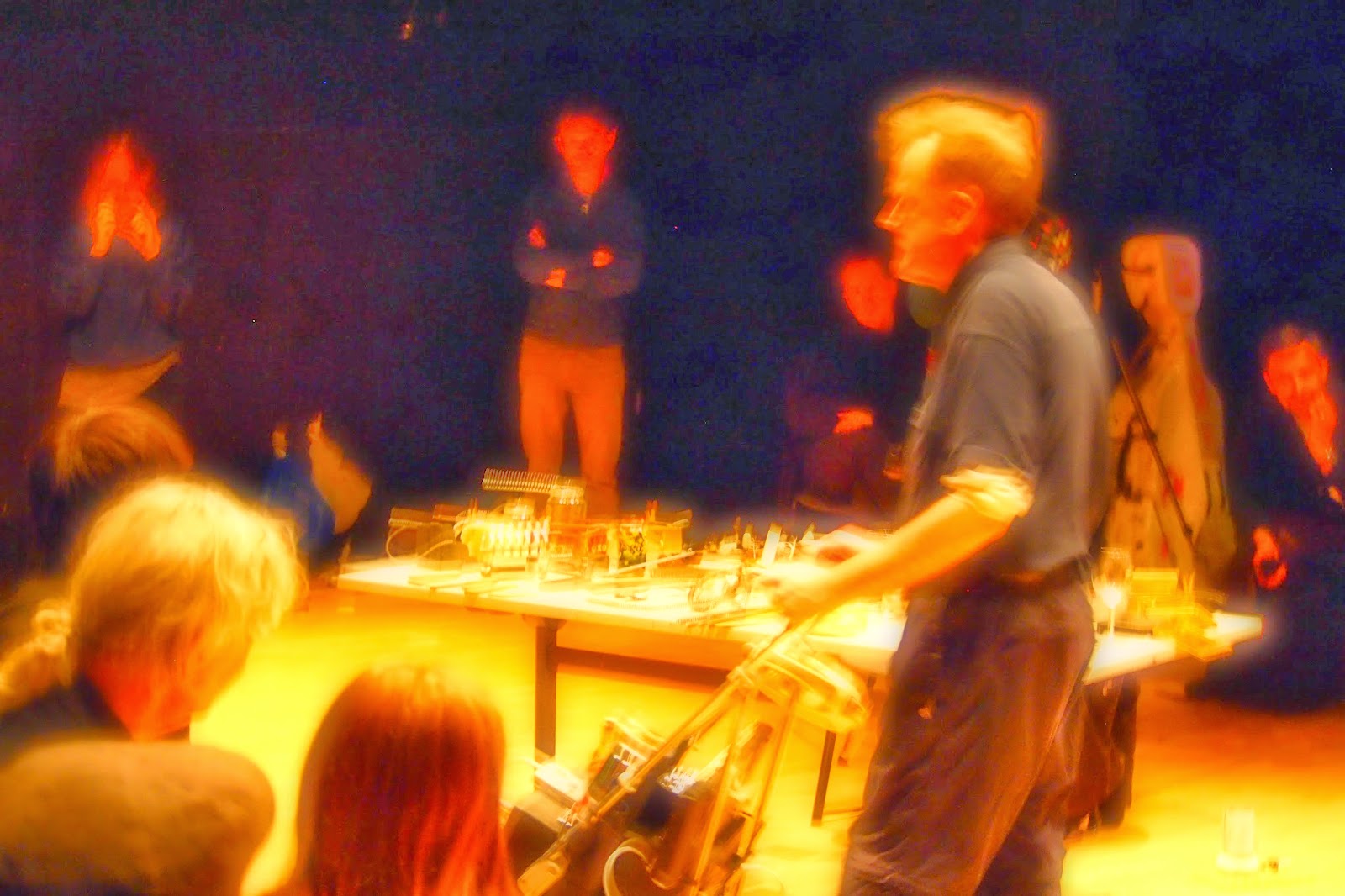 Granary Building was hosting yesterday's night a very interesting event presenting 10 performers from diverse backgrounds. The show started with This Heat's legend Charles Hayward marching on with hissy snare drum solo intricate and yet very minimalistic drumming which lead on the guests by the bread crumb trail of electronic DIY toys by Rie Nakajima wriggling on the floor straight to the studio theatre room where Pierre Berthet was waiting with his elaborate live action installment of intricate hoover - I felt that this is definitely start of something larger and enjoyed this bit a lot as very ingenious and simple as it might have seemed but requiring great attention. Next minimalistic set of Lore Lixenberg's voice and Anton Lukoszevieze playing cello had a steady narrative to it and with Lore slowly walking through the room it was embraced in a very theatrical way so to speak. Adam Bohman of Bohman bros this time gave a scratchy outlet of curiosities a second chance with him sweating off every possible way to get the junk speaking in a way he mastered perfectly. The next step was a joint combo of Edwina Ashton and Daniel Ashton and another artist whose name I couldn't find in the line up list making very simplistic digitalised game which was nice visually but I intentionally took as a breather. Jennifer Allum who played solo violin was on the other hand really deep experience - her sonorous introduction made way towards more narrative and tonal or semi-tonal themes which were very interesting and involving. David Toop with Rie gave a steady and quite conservative flow of guitar overtones and feedback and wriggling show of DIY insect world. The show was finalised by a cat drama of masked mimes and Charles Hayward again walking with electrified and amplified push chair singing and playing keys and wind instrument. It felt like a minute theatre of distant waves of emotions, longing put in a puzzle of repeated phrases which were slowly growing in meaningful phases until Charles left.